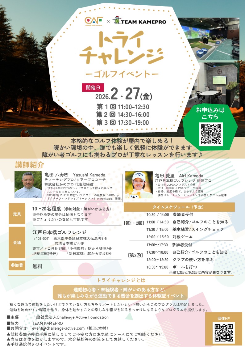 この度、Challenge Active Foundation(CAF)は、TEAM KAMEPROのご協力のもと、障がいのある方を対象とした「トライチャレンジ ゴルフイベント」を開催する運びとなりました。